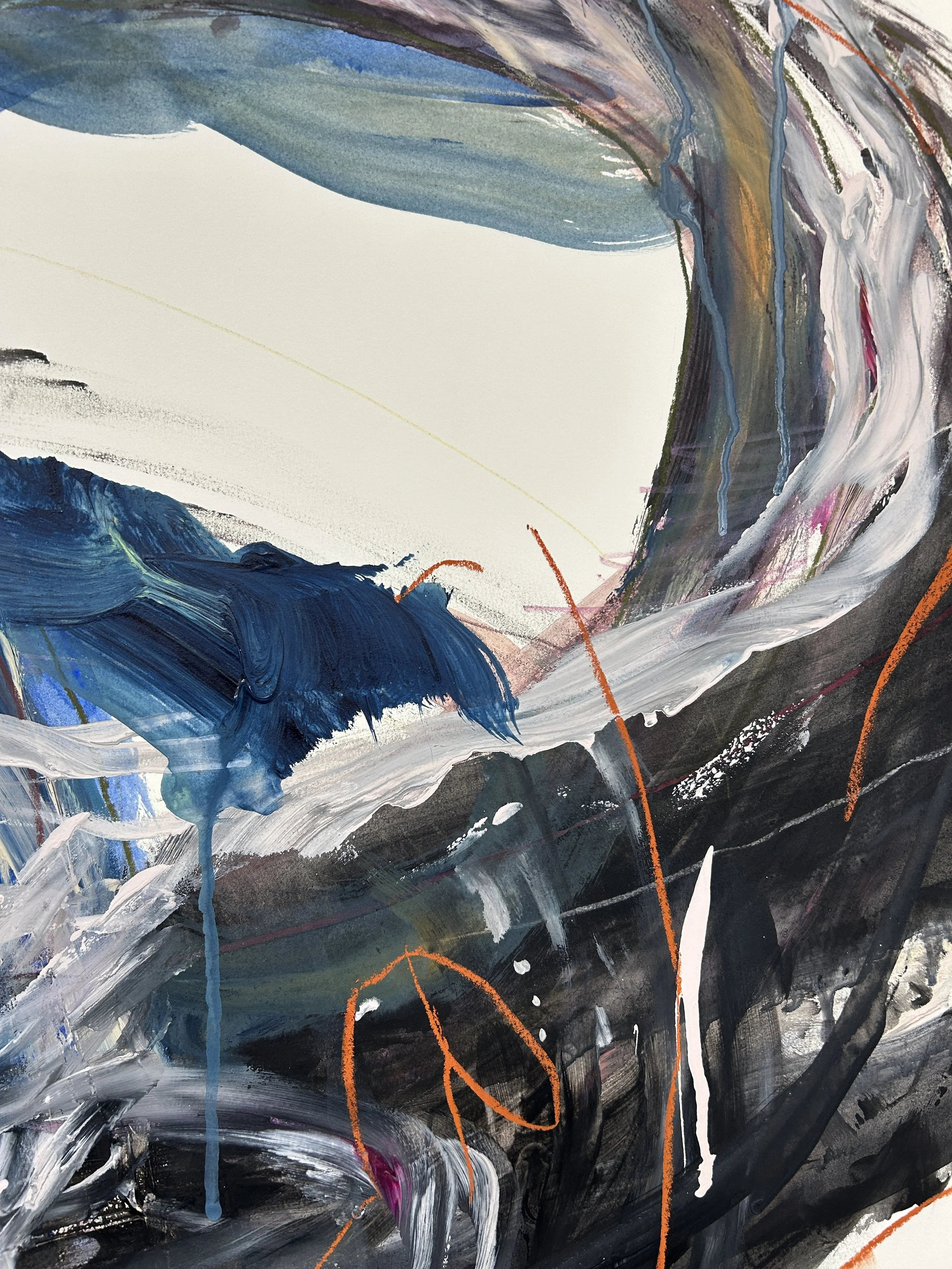 The summer of 2023 was intensely hot, with sudden drenching storms blowing in and thick smoke from northern wildfires blanketing the air for days on end. My studio practice was driven by a submission to these elements, resulting in a series of large, quick paintings of tornado-like loops. These forms had been present in my work in the mid-2000s, as a symbol of my mother who passed away in 2005, and now re-emerged while my own children were away at camp - a brief pause in my responsibilities of motherhood. These tornado shapes - squiggly swoops with dangling legs - have taken on many new forms to me as this body of work progresses, and their meanings evolve as time goes by; some now appear as whirlpools or black holes, gaping mouths, bombs and the craters they leave behind.